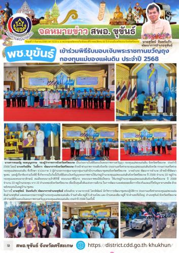 ในการนี้ นายสุรัตน์ อินทร์แก้ว พัฒนาการอำเภอขุขันธ์ พร้อมด้วย นางมาธวรรย์ ไตรพิพัฒน์ นักวิชาการพัฒนาชุมชนปฏิบัติการ ประธานเครือข่ายกองทุนแม่ของแผ่นดินอำเภอขุขันธ์ และคณะกรรมการหมู่บ้านกองทุนแม่ของแผ่นดิน บ้านคำเผือ หมู่ที่ 5 ตำบลโสน และ บ้านหนองสิม หมู่ที่ 19 ตำบลปรือใหญ่ อำเภอขุขันธ์ จังหวัดศรีสะเกษ เข้าร่วมพิธีรับมอบเงินพระราชทานขวัญถุงกองทุนแม่ของแผ่นดิน ประจำปี 2568 ในครั้งนี้