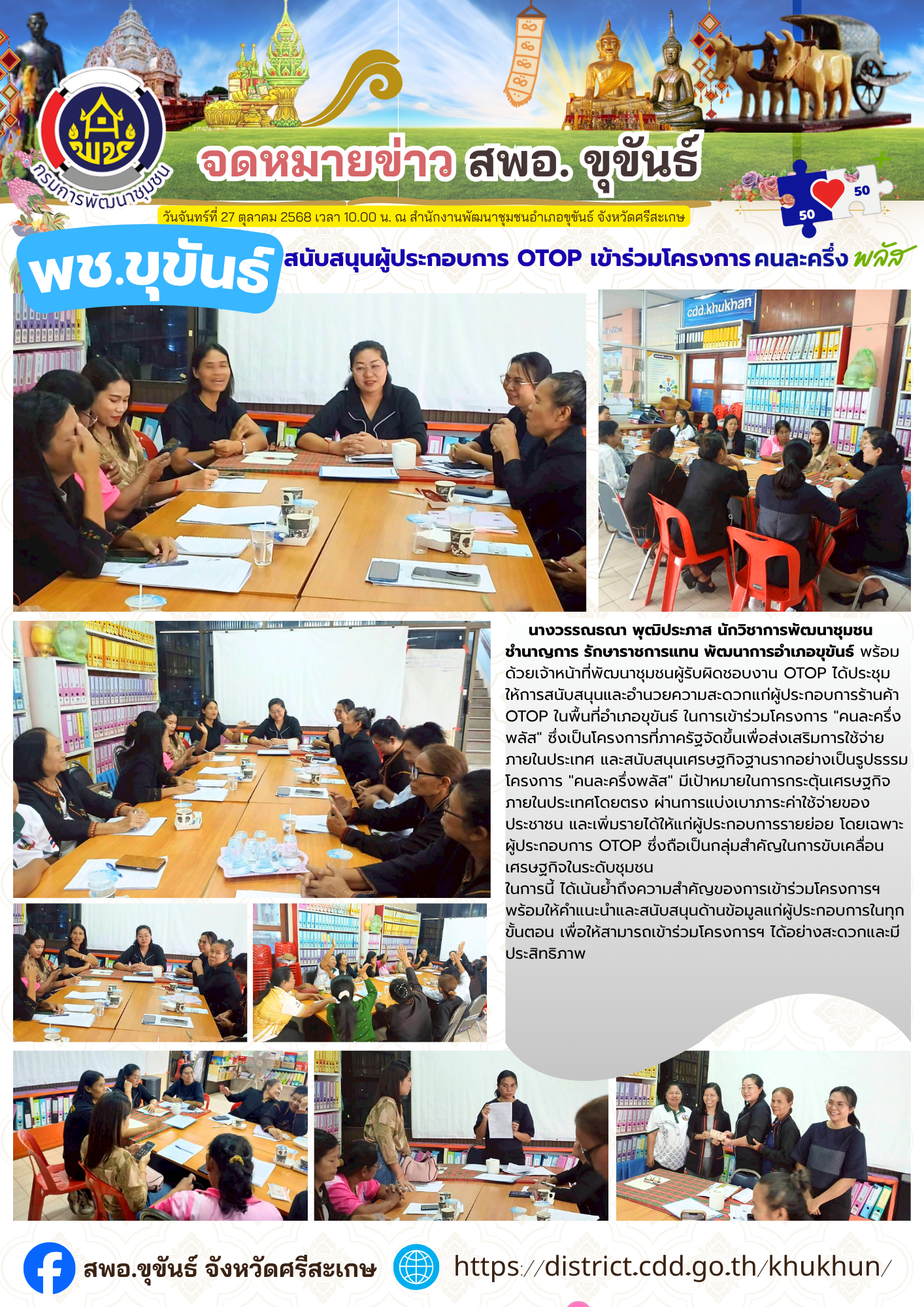 นางวรรณธณา พุฒิประภาส นักวิชาการพัฒนาชุมชนชำนาญการ รักษาราชการแทน พัฒนาการอำเภอขุขันธ์ พร้อมด้วยเจ้าหน้าที่พัฒนาชุมชนผู้รับผิดชอบงาน OTOP ได้ประชุมให้การสนับสนุนและอำนวยความสะดวกแก่ผู้ประกอบการร้านค้า OTOP ในพื้นที่อำเภอขุขันธ์ ในการเข้าร่วมโครงการ "คนละครึ่งพลัส" ซึ่งเป็นโครงการที่ภาครัฐจัดขึ้นเพื่อส่งเสริมการใช้จ่ายภายในประเทศ และสนับสนุนเศรษฐกิจฐานรากอย่างเป็นรูปธรรม