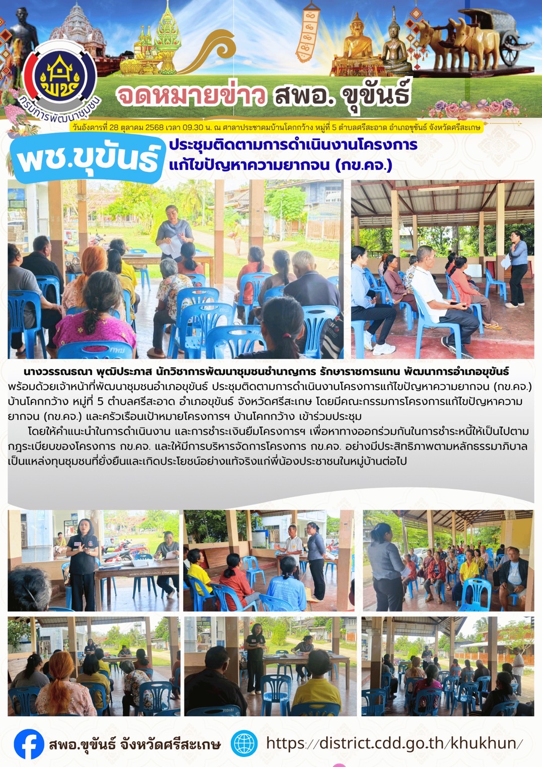 นางวรรณธณา พุฒิประภาส นักวิชาการพัฒนาชุมชนชำนาญการ รักษาราชการแทน พัฒนาการอำเภอขุขันธ์ พร้อมด้วยเจ้าหน้าที่พัฒนาชุมชนอำเภอขุขันธ์ ประชุมติดตามการดำเนินงานโครงการแก้ไขปัญหาความยากจน (กข.คจ.) บ้านโคกกว้าง หมู่ที่ 5 ตำบลศรีสะอาด อำเภอขุขันธ์ จังหวัดศรีสะเกษ โดยมีคณะกรรมการโครงการแก้ไขปัญหาความยากจน (กข.คจ.) และครัวเรือนเป้าหมายโครงการฯ บ้านโคกกว้าง เข้าร่วมประชุม