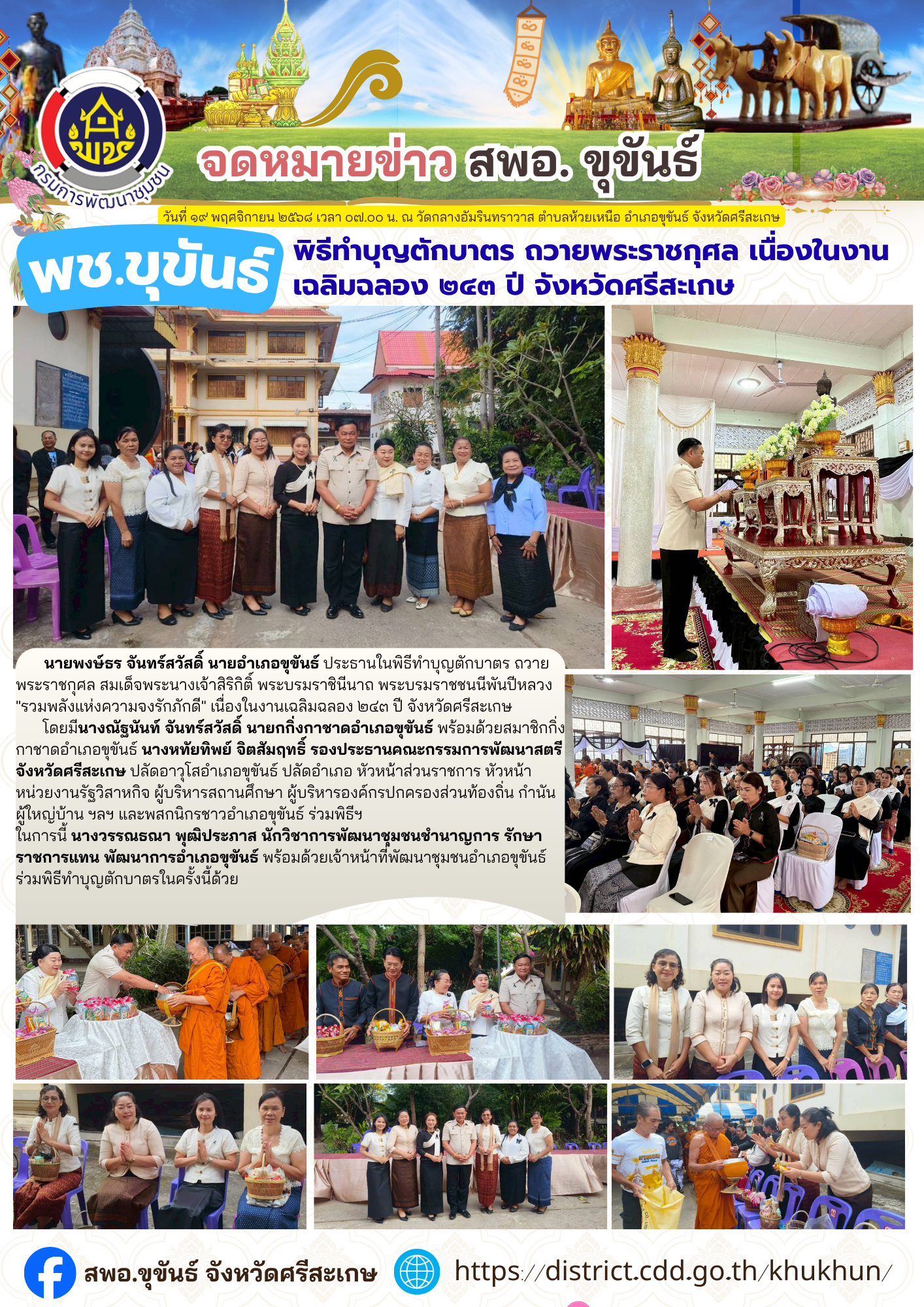 วันที่ ๑๙ พฤศจิกายน ๒๕๖๘ เวลา ๐๗.๐๐ น. ณ วัดกลางอัมรินทราวาส ตำบลห้วยเหนือ อำเภอขุขันธ์ จังหวัดศรีสะเกษ