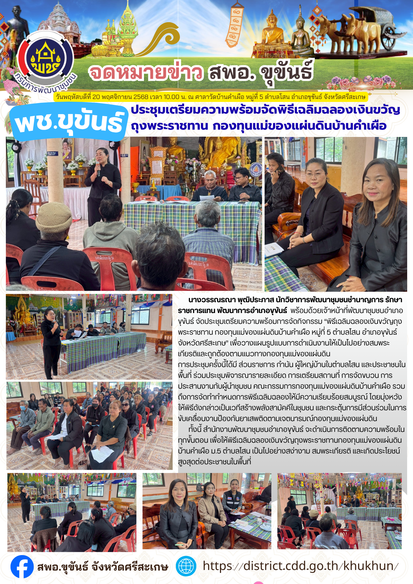 วันพฤหัสบดีที่ 20 พฤศจิกายน 2568 เวลา 10.00 น. ณ ศาลาวัดบ้านคำเผือ หมู่ที่ 5 ตำบลโสน อำเภอขุขันธ์ จังหวัดศรีสะเกษ