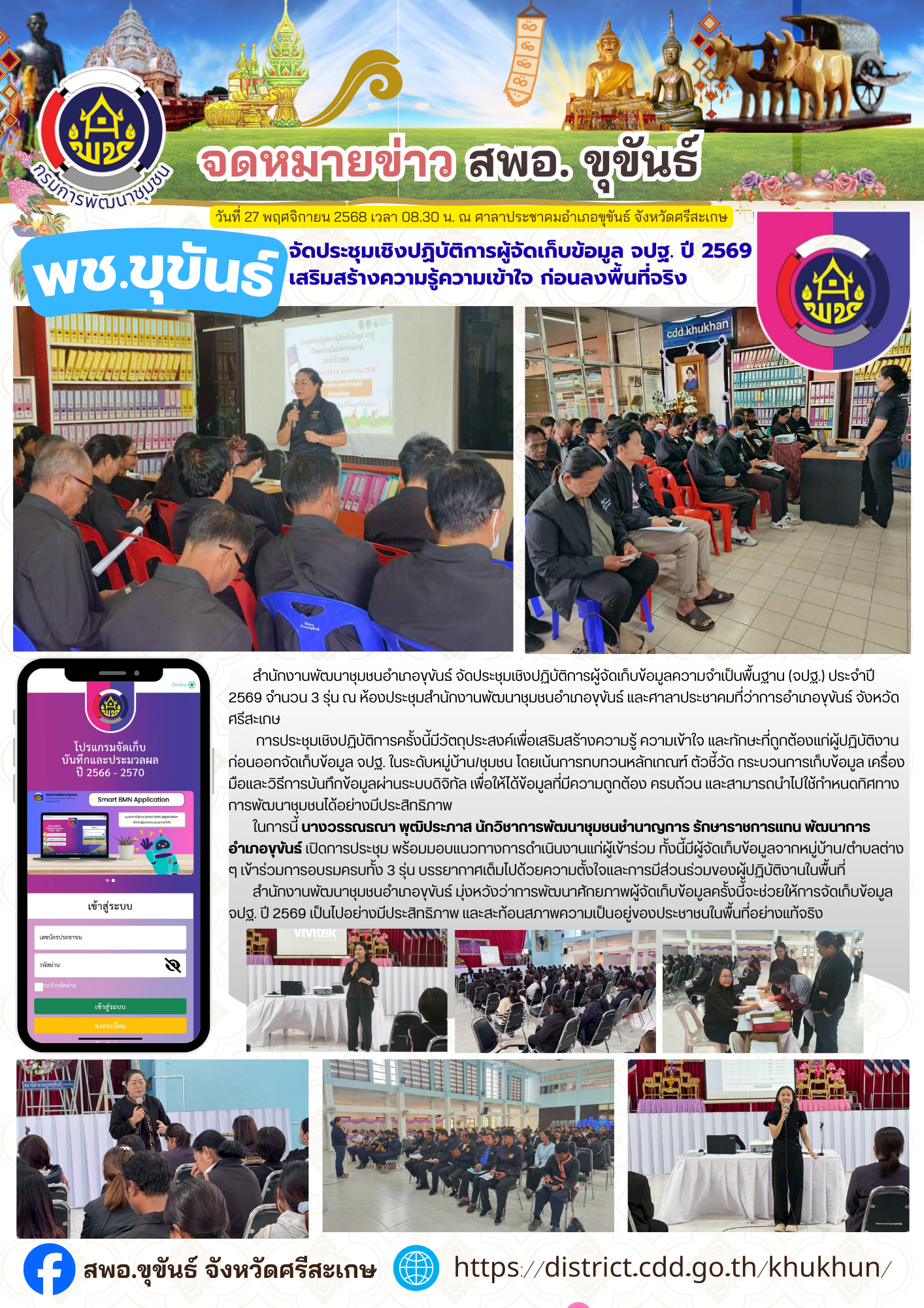 สำนักงานพัฒนาชุมชนอำเภอขุขันธ์ มุ่งหวังว่าการพัฒนาศักยภาพผู้จัดเก็บข้อมูลครั้งนี้จะช่วยให้การจัดเก็บข้อมูล จปฐ. ปี 2569 เป็นไปอย่างมีประสิทธิภาพ และสะท้อนสภาพความเป็นอยู่ของประชาชนในพื้นที่อย่างแท้จริง