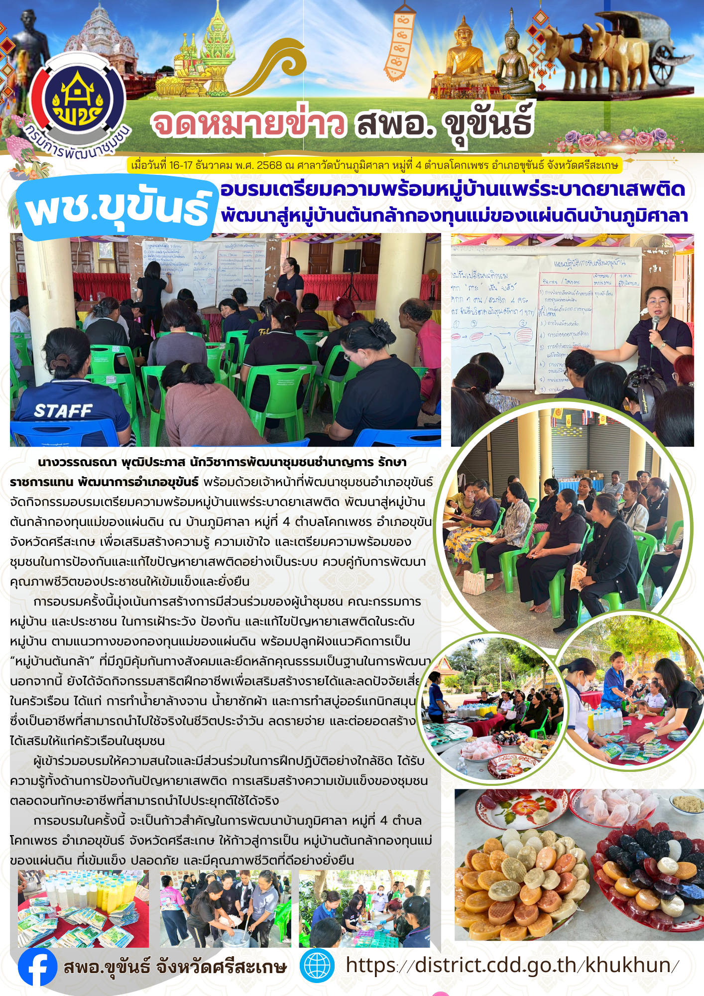 นางวรรณธณา พุฒิประภาส นักวิชาการพัฒนาชุมชนชำนาญการ รักษาราชการแทน พัฒนาการอำเภอขุขันธ์ พร้อมด้วยเจ้าหน้าที่พัฒนาชุมชนอำเภอขุขันธ์ จัดกิจกรรมอบรมเตรียมความพร้อมหมู่บ้านแพร่ระบาดยาเสพติด พัฒนาสู่หมู่บ้านต้นกล้ากองทุนแม่ของแผ่นดิน ณ บ้านภูมิศาลา หมู่ที่ 4 ตำบลโคกเพชร อำเภอขุขันธ์ จังหวัดศรีสะเกษ เพื่อเสริมสร้างความรู้ ความเข้าใจ และเตรียมความพร้อมของชุมชนในการป้องกันและแก้ไขปัญหายาเสพติดอย่างเป็นระบบ ควบคู่กับการพัฒนาคุณภาพชีวิตของประชาชนให้เข้มแข็งและยั่งยืน