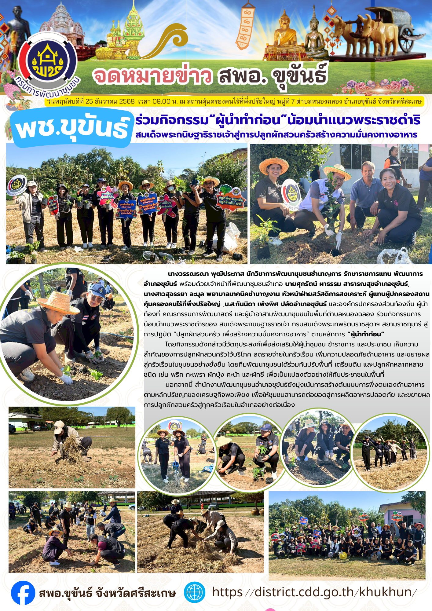 นางวรรณธณา พุฒิประภาส นักวิชาการพัฒนาชุมชนชำนาญการ รักษาราชการแทน พัฒนาการอำเภอขุขันธ์ พร้อมด้วยเจ้าหน้าที่พัฒนาชุมชนอำเภอ นายศุภรัตน์ ผาธรรม สาธารณสุขอำเภอขุขันธ์, นางสาวสุจรรยา ละมุล พยาบาลเทคนิคชำนาญงาน หัวหน้าฝ่ายสวัสดิการสงเคราะห์ ผู้แทนผู้ปกครองสถานคุ้มครองคนไร้ที่พึ่งปรือใหญ่ ,น.ส.กันนิดา เพ่งพิศ ปลัดอำเภอขุขันธ์ และองค์กรปกครองส่วนท้องถิ่น ผู้นำท้องที่ คณธกรรมการพัฒนาสตรี และผู้นำอาสามพัฒนาชุมชนในพื้นที่ตำบลหนองฉลอง ร่วมกิจกรรมการน้อมนำแนวพระราชดำริของ สมเด็จพระกนิษฐาธิราชเจ้า กรมสมเด็จพระเทพรัตนราชสุดาฯ สยามราชกุมารี สู่การปฏิบัติ “ปลูกผักสวนครัว เพื่อสร้างความมั่นคงทางอาหาร” ตามหลักการ “ผู้นำทำก่อน”