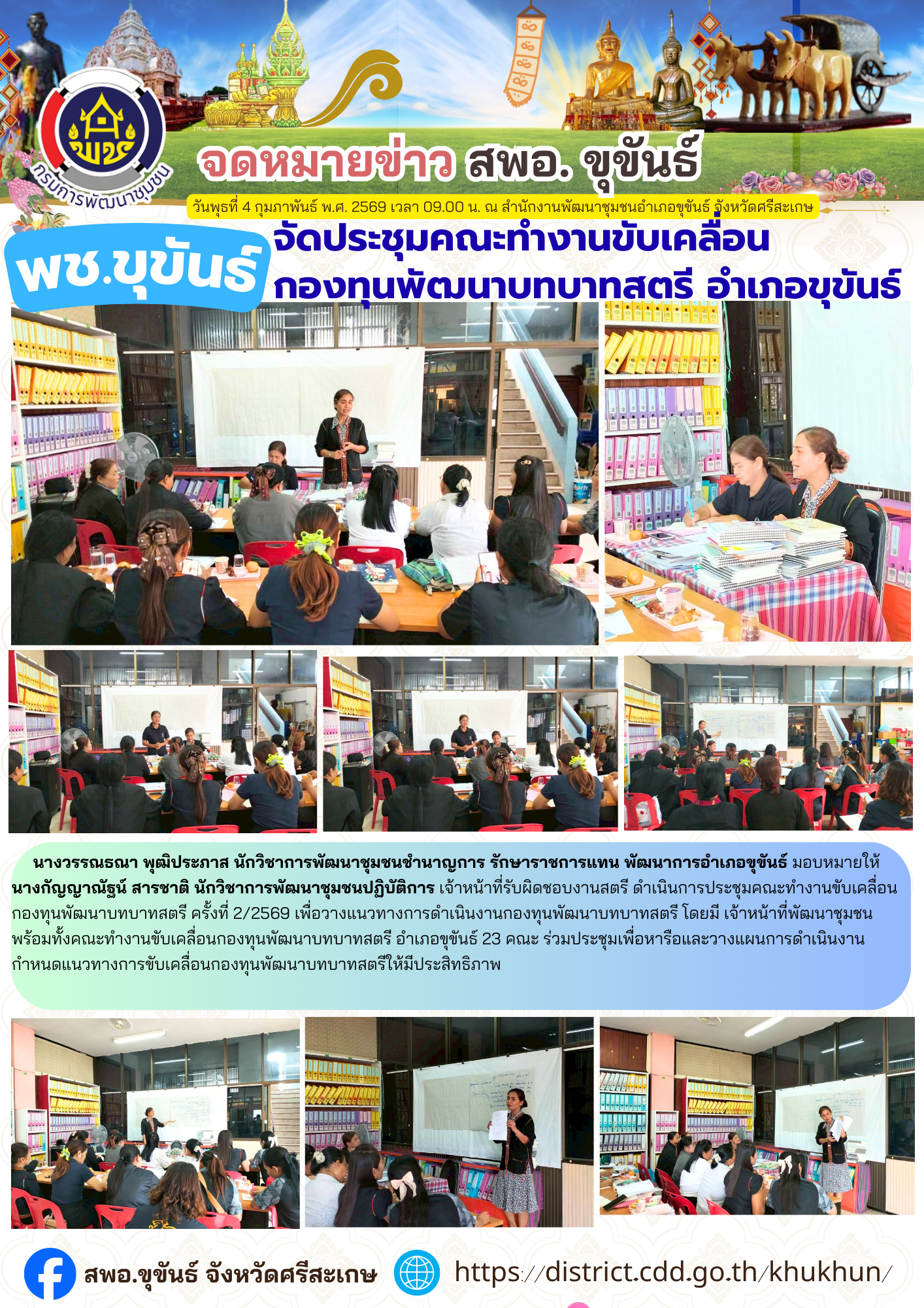 วันพุธที่ 4 กุมภาพันธ์ พ.ศ. 2569 เวลา 09.00 น. ณ สำนักงานพัฒนาชุมชนอำเภอขุขันธ์ จังหวัดศรีสะเกษ