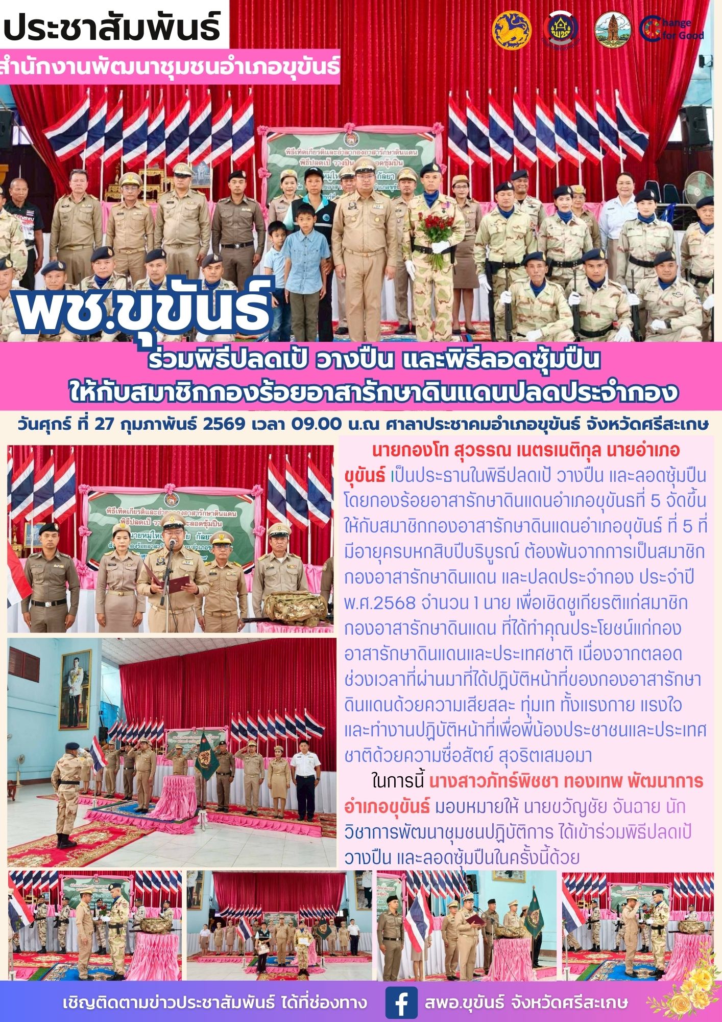 วันศุกร์ ที่ 27 กุมภาพันธ์ 2569 เวลา 09.00 น.ณ ศาลาประชาคมอำเภอขุขันธ์ จังหวัดศรีสะเกษ