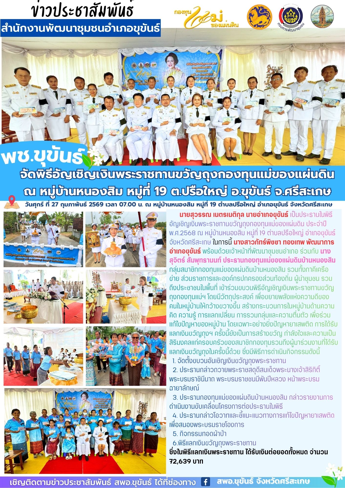 วันศุกร์ ที่ 27 กุมภาพันธ์ 2569 เวลา 07.00 น. ณ หมู่บ้านหนองสิม หมู่ที่ 19 ตำบลปรือใหญ่ อำเภอขุขันธ์ จังหวัดศรีสะเกษ