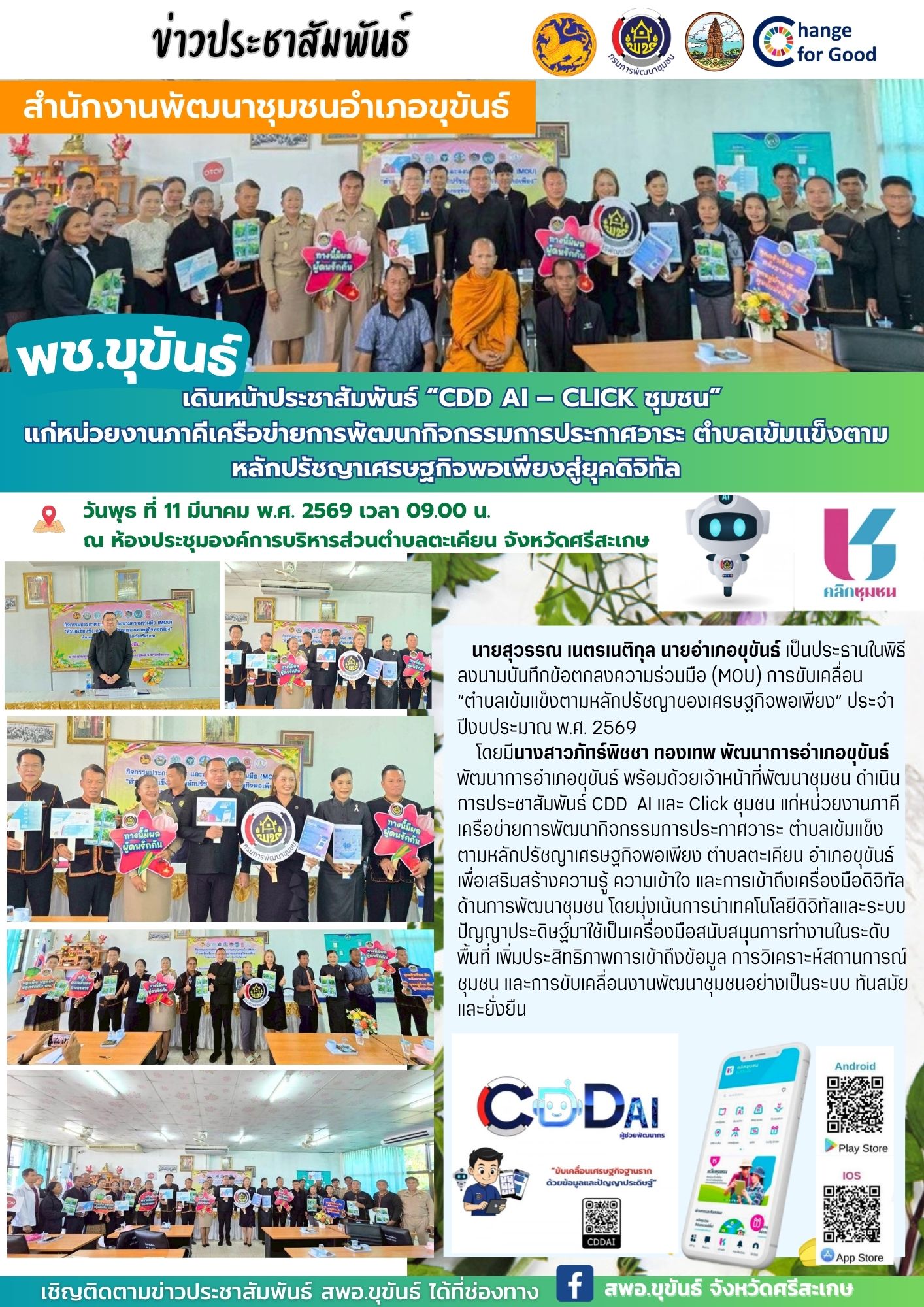 โดยมี นางสาวภัทร์พิชชา ทองเทพ พัฒนาการอำเภอขุขันธ์ พัฒนาการอำเภอขุขันธ์ พร้อมด้วยเจ้าหน้าที่พัฒนาชุมชน ดำเนินการประชาสัมพันธ์ CDD AI และ Click ชุมชน แก่หน่วยงานภาคีเครือข่ายการพัฒนากิจกรรมการประกาศวาระ ตำบลเข้มแข็งตามหลักปรัชญาเศรษฐกิจพอเพียง ตำบลตะเคียน อำเภอขุขันธ์ เพื่อเสริมสร้างความรู้ ความเข้าใจ และการเข้าถึงเครื่องมือดิจิทัลด้านการพัฒนาชุมชน โดยมุ่งเน้นการนำเทคโนโลยีดิจิทัลและระบบปัญญาประดิษฐ์มาใช้เป็นเครื่องมือสนับสนุนการทำงานในระดับพื้นที่ เพิ่มประสิทธิภาพการเข้าถึงข้อมูล การวิเคราะห์สถานการณ์ชุมชน และการขับเคลื่อนงานพัฒนาชุมชนอย่างเป็นระบบ ทันสมัย และยั่งยืน