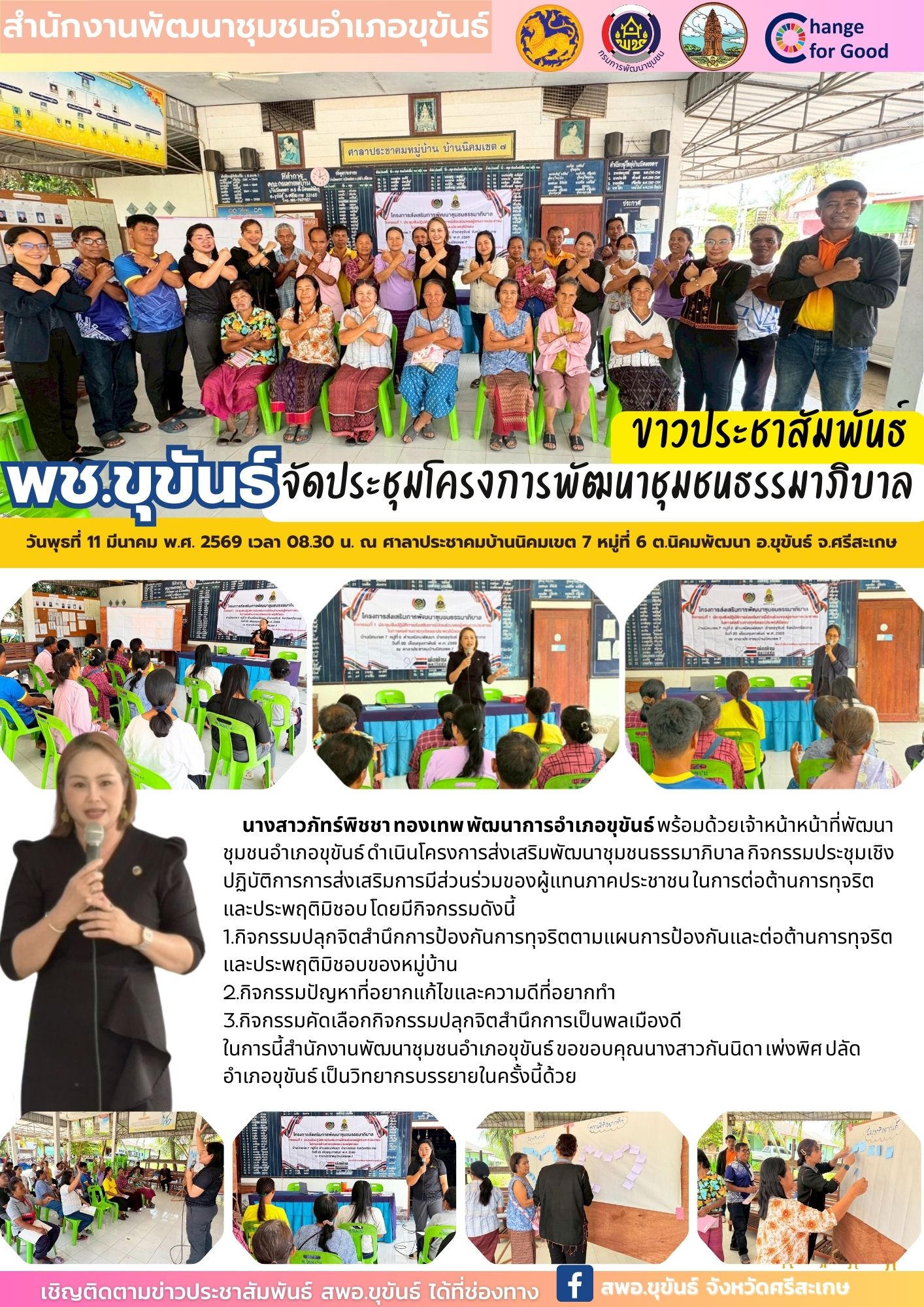 นางสาวภัทร์พิชชา ทองเทพ พัฒนาการอำเภอขุขันธ์ พร้อมด้วยเจ้าหน้าหน้าที่พัฒนาชุมชนอำเภอขุขันธ์ ดำเนินโครงการส่งเสริมพัฒนาชุมชนธรรมาภิบาล กิจกรรมประชุมเชิงปฏิบัติการการส่งเสริมการมีส่วนร่วมของผู้แทนภาคประชาชน ในการต่อต้านการทุจริตและประพฤติมิชอบ โดยมีกิจกรรมดังนี้ 1.กิจกรรมปลุกจิตสำนึกการป้องกันการทุจริตตามแผนการป้องกันและต่อต้านการทุจริตและประพฤติมิชอบของหมู่บ้าน 2.กิจกรรมปัญหาที่อยากแก้ไขและความดีที่อยากทำ 3.กิจกรรมคัดเลือกกิจกรรมปลุกจิตสำนึกการเป็นพลเมืองดี