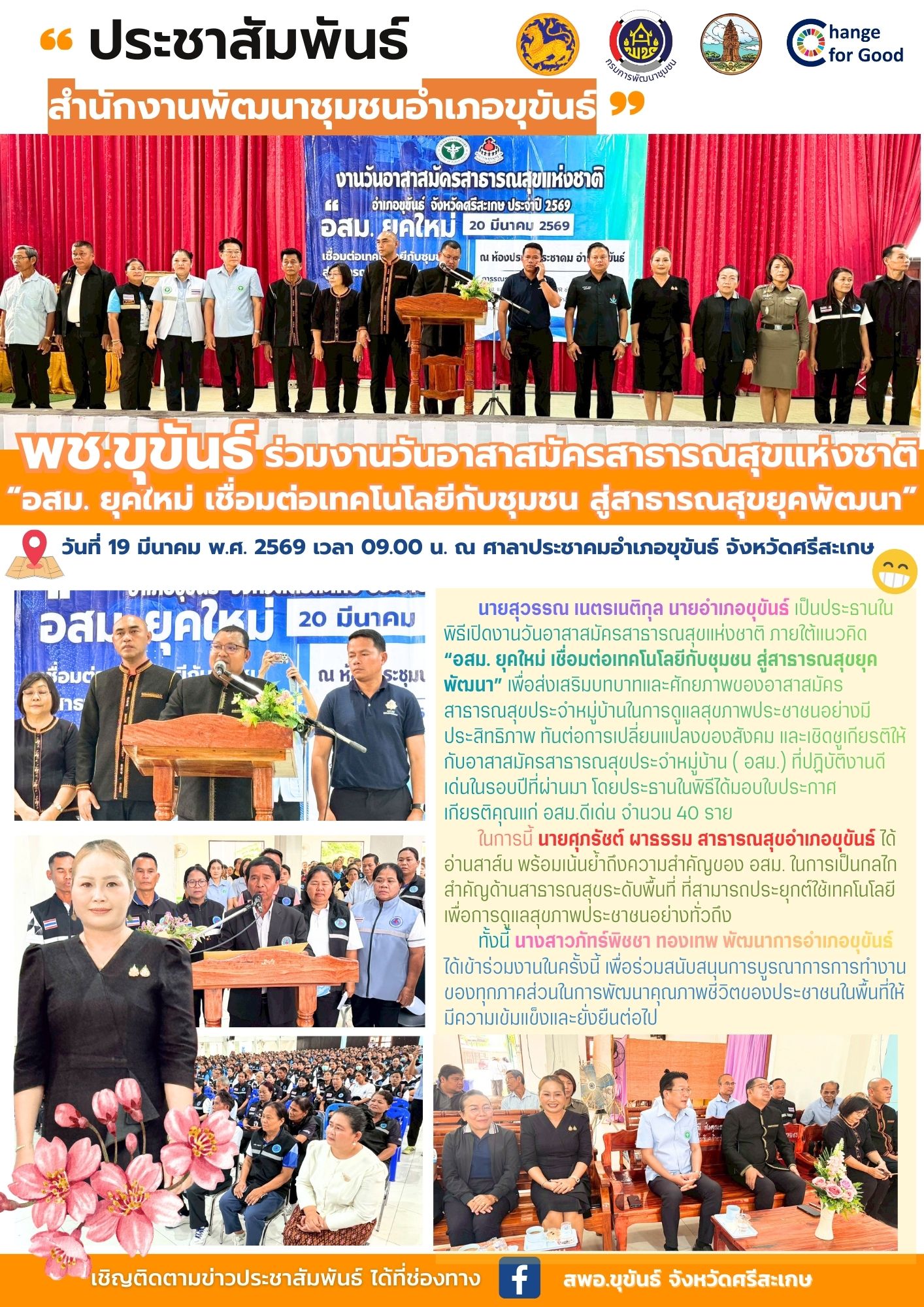 นายสุวรรณ เนตรเนติกุล นายอำเภอขุขันธ์ เป็นประธานในพิธีเปิดงานวันอาสาสมัครสาธารณสุขแห่งชาติ ภายใต้แนวคิด “อสม. ยุคใหม่ เชื่อมต่อเทคโนโลยีกับชุมชน สู่สาธารณสุขยุคพัฒนา” เพื่อส่งเสริมบทบาทและศักยภาพของอาสาสมัครสาธารณสุขประจำหมู่บ้านในการดูแลสุขภาพประชาชนอย่างมีประสิทธิภาพ ทันต่อการเปลี่ยนแปลงของสังคม และเชิดชูเกียรติให้กับอาสาสมัครสาธารณสุขประจำหมู่บ้าน ( อสม.) ที่ปฏิบัติงานดีเด่นในรอบปีที่ผ่านมา โดยประธานในพิธีได้มอบใบประกาศเกียรติคุณแก่ อสม.ดีเด่น จำนวน 40 ราย
