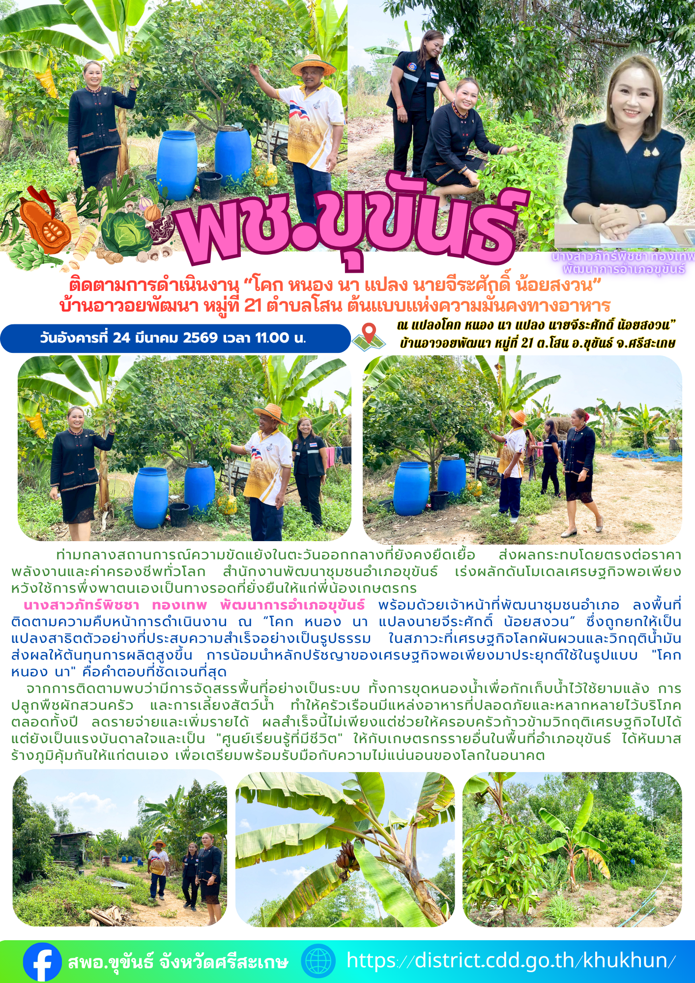 นางสาวภัทร์พิชชา ทองเทพ พัฒนาการอำเภอขุขันธ์ พร้อมด้วยเจ้าหน้าที่พัฒนาชุมชนอำเภอ ลงพื้นที่ติดตามความคืบหน้าการดำเนินงาน ณ “โคก หนอง นา แปลงนายจีระศักดิ์ น้อยสงวน” ซึ่งถูกยกให้เป็นแปลงสาธิตตัวอย่างที่ประสบความสำเร็จอย่างเป็นรูปธรรม ในสภาวะที่เศรษฐกิจโลกผันผวนและวิกฤติน้ำมันส่งผลให้ต้นทุนการผลิตสูงขึ้น การน้อมนำหลักปรัชญาของเศรษฐกิจพอเพียงมาประยุกต์ใช้ในรูปแบบ "โคก หนอง นา" คือคำตอบที่ชัดเจนที่สุด
