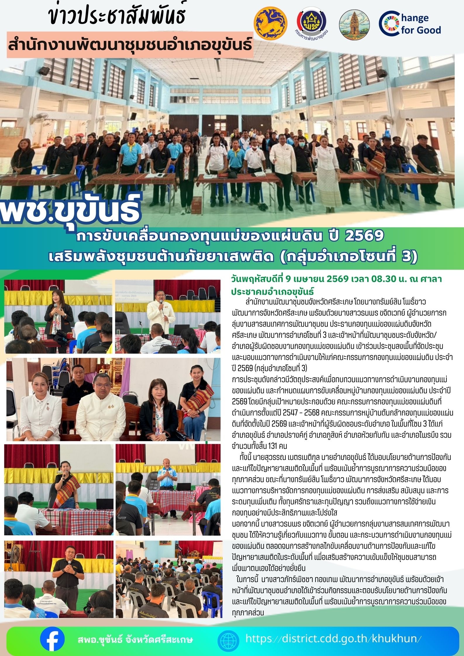 วันที่ 9 เมษายน 2569 เวลา 11.00 น. ณ บ้านพักพัฒนาการจังหวัดศรีสะเกษ และบริเวณบ้านพักนายอำเภอขุขันธ์ จังหวัดศรีสะเกษ