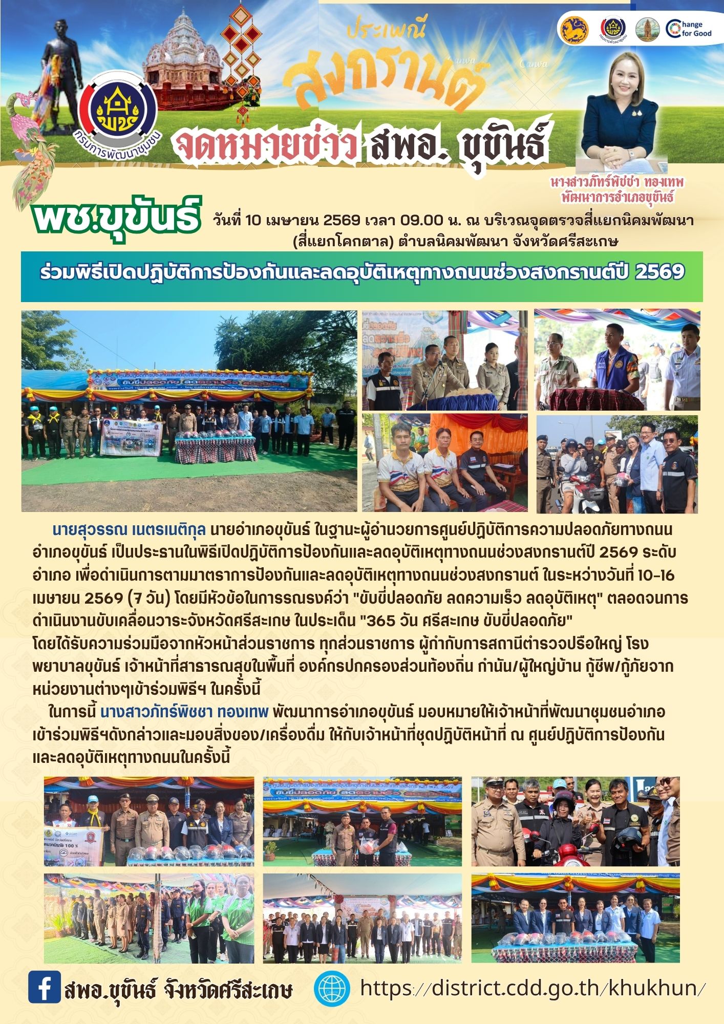 นายสุวรรณ เนตรเนติกุล นายอำเภอขุขันธ์ ในฐานะผู้อำนวยการศูนย์ปฏิบัติการความปลอดภัยทางถนนอำเภอขุขันธ์ เป็นประธานในพิธีเปิดปฏิบัติการป้องกันและลดอุบัติเหตุทางถนนช่วงสงกรานต์ปี 2569 ระดับอำเภอ เพื่อดำเนินการตามมาตราการป้องกันและลดอุบัติเหตุทางถนนช่วงสงกรานต์ ในระหว่างวันที่ 10-16 เมษายน 2569 (7 วัน) โดยมีหัวข้อในการรณรงค์ว่า "ขับขี่ปลอดภัย ลดความเร็ว ลดอุบัติเหตุ" ตลอดจนการดำเนินงานขับเคลื่อนวาระจังหวัดศรีสะเกษ ในประเด็น "365 วัน ศรีสะเกษ ขับขี่ปลอดภัย"