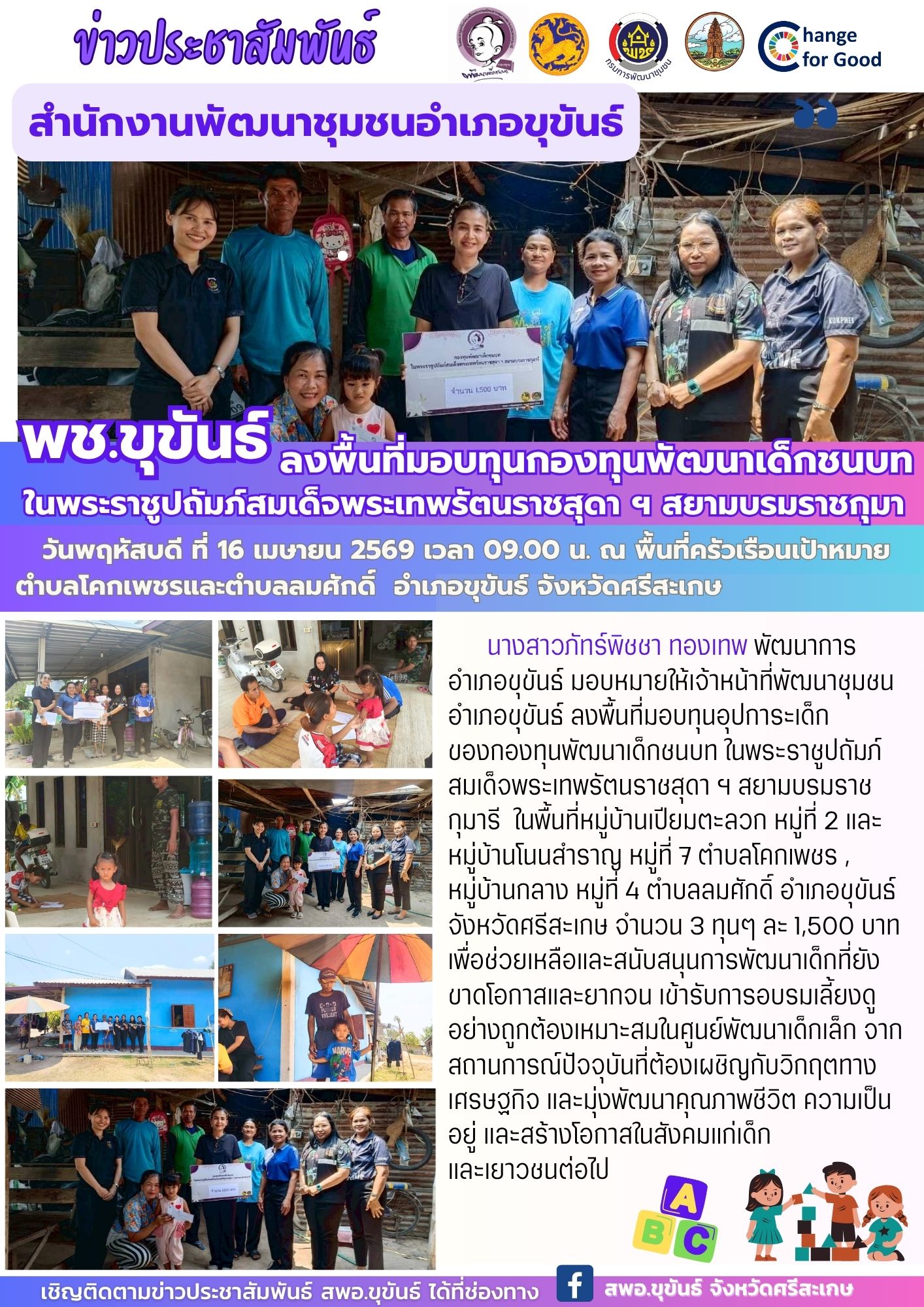นางสาวภัทร์พิชชา ทองเทพ พัฒนาการอำเภอขุขันธ์ มอบหมายให้เจ้าหน้าที่พัฒนาชุมชนอำเภอขุขันธ์ ลงพื้นที่มอบทุนอุปการะเด็กของกองทุนพัฒนาเด็กชนบท ในพระราชูปถัมภ์ สมเด็จพระเทพรัตนราชสุดา ฯ สยามบรมราชกุมารี ในพื้นที่หมู่บ้านเปียมตะลวก หมู่ที่ 2 และหมู่บ้านโนนสำราญ หมู่ที่ 7 ตำบลโคกเพชร , หมู่บ้านกลาง หมู่ที่ 4 ตำบลลมศักดิ์ อำเภอขุขันธ์ จังหวัดศรีสะเกษ จำนวน 3 ทุนๆ ละ 1,500 บาท เพื่อช่วยเหลือและสนับสนุนการพัฒนาเด็กที่ยังขาดโอกาสและยากจน เข้ารับการอบรมเลี้ยงดูอย่างถูกต้องเหมาะสมในศูนย์พัฒนาเด็กเล็ก จากสถานการณ์ปัจจุบันที่ต้องเผชิญกับวิกฤตทางเศรษฐกิจ และมุ่งพัฒนาคุณภาพชีวิต ความเป็นอยู่ และสร้างโอกาสในสังคมแก่เด็กและเยาวชนต่อไป